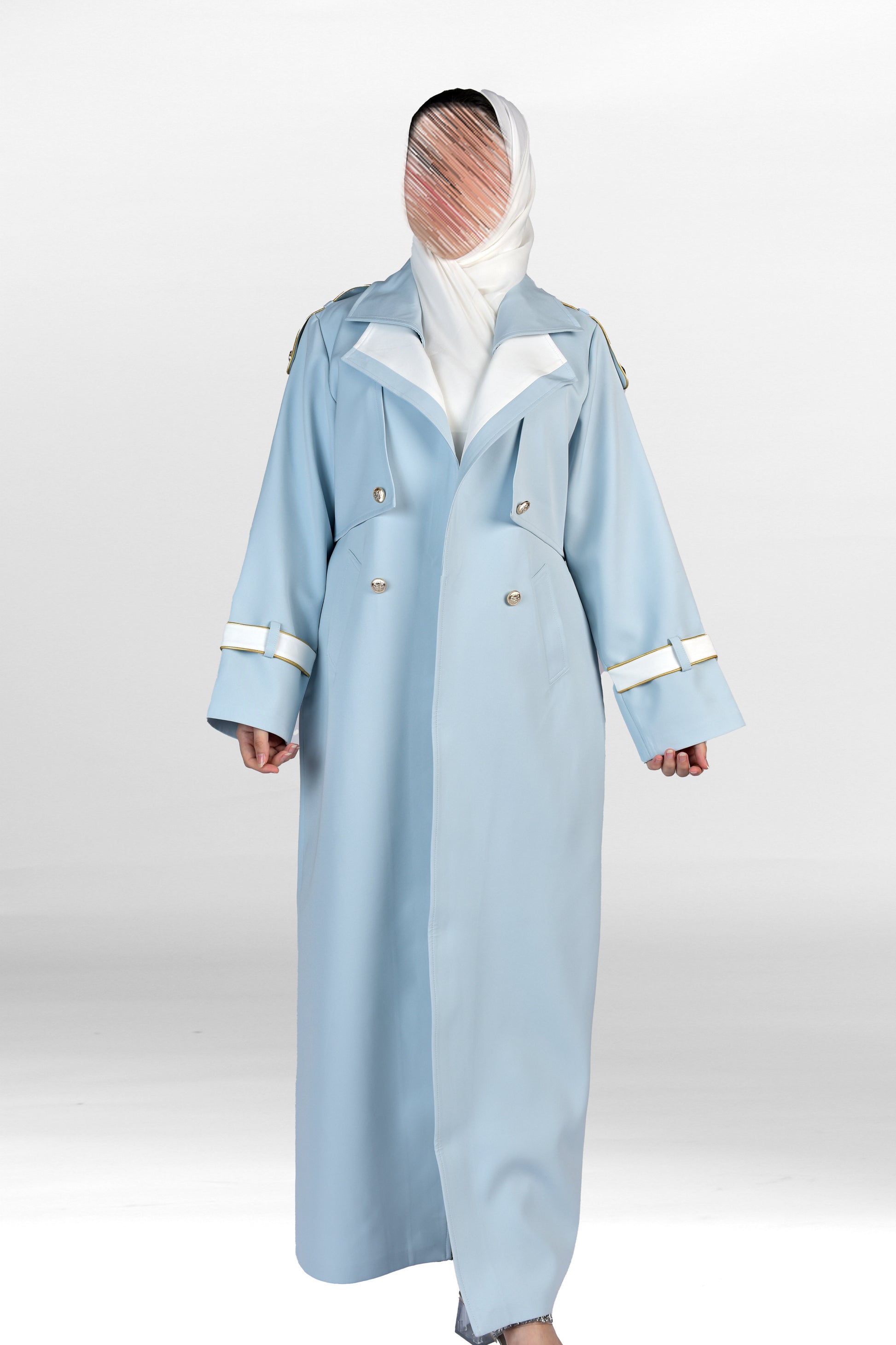 بليزر انيق بلون السماوي الزاهي من الكريب الراقي المناسب لكل فصول السنه مزينة بتفاصيل بيضاء ولمسات ذهبية لتمنحها طابع عصري