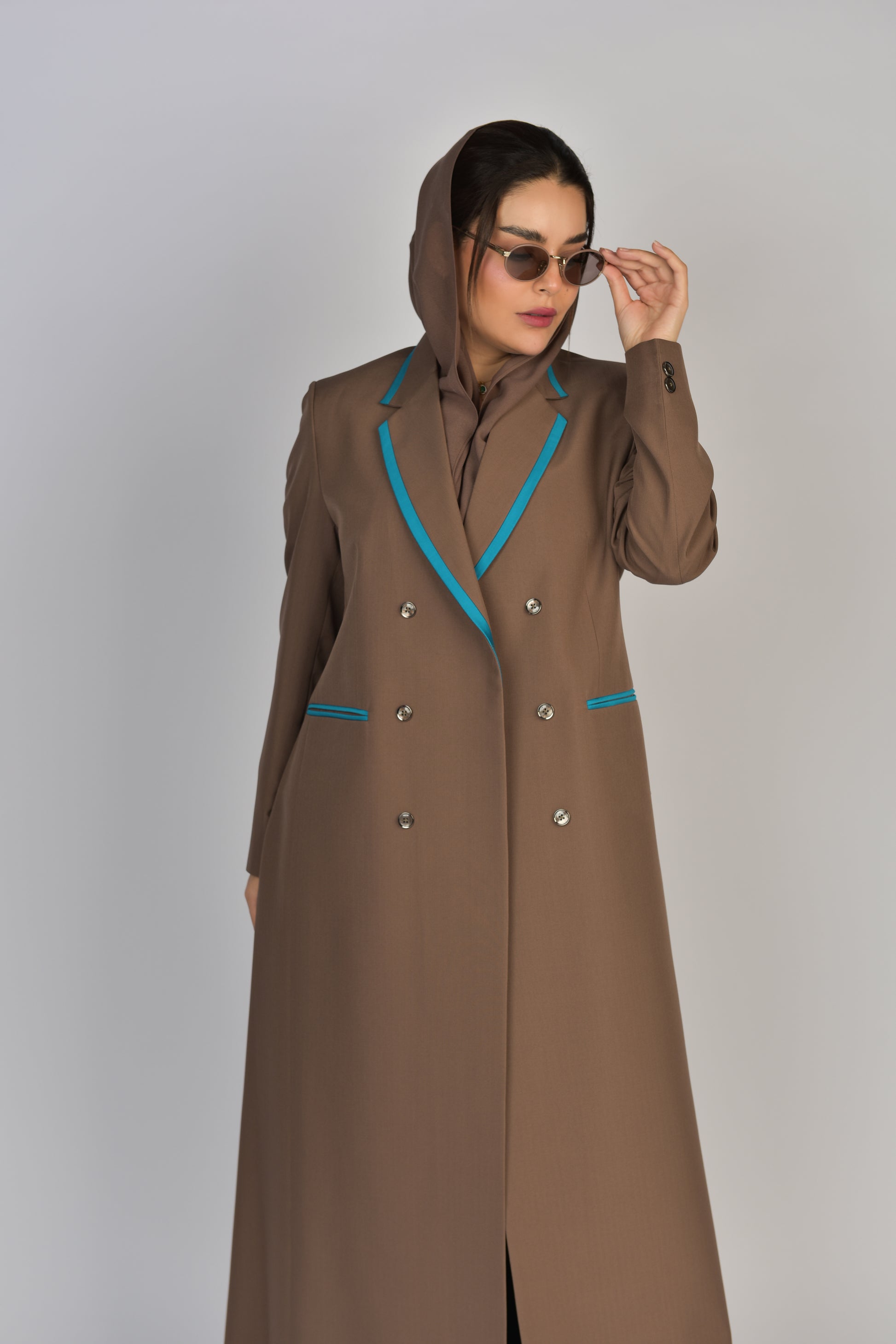 بليزر عملي ومريح من الكريب البني يتميز بدمج الالوان حيث يزينه شريط باللون الازرق على الياقة والجيوب