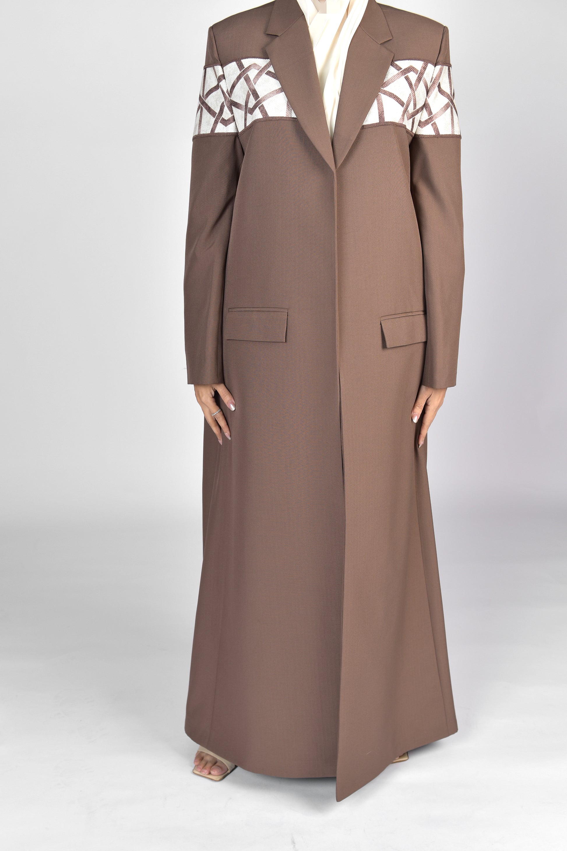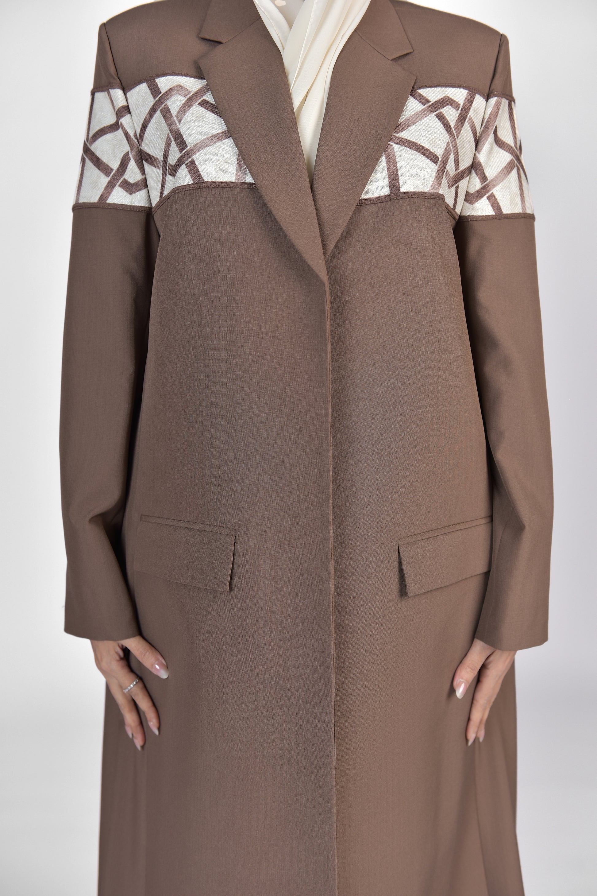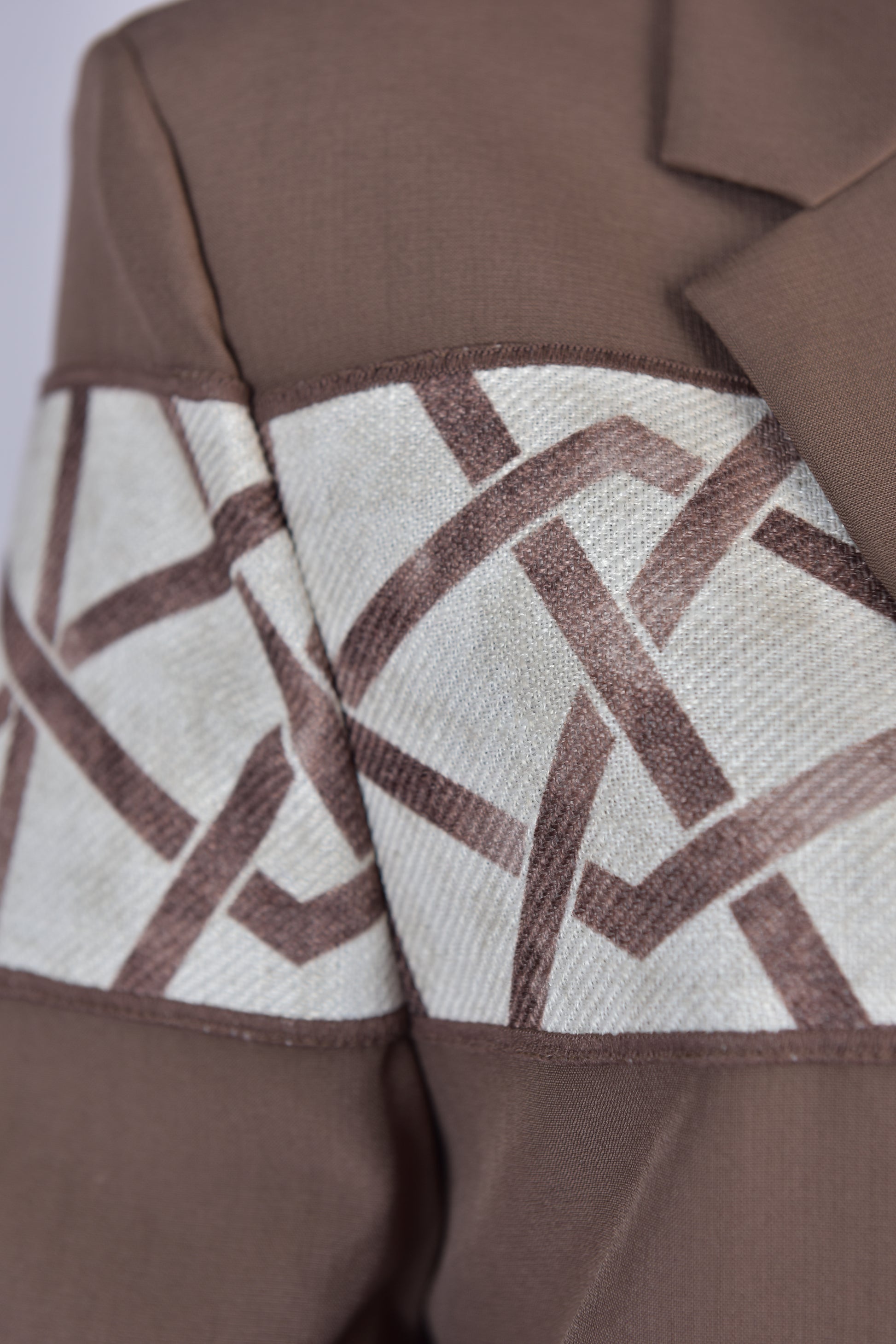 بليزر صيفي من الكتان الخفيف باللون البني ومضاف اليه نقشات هندسية باللون الاوف وايت ويتوفر منه الوان اخرى حسب الطلب