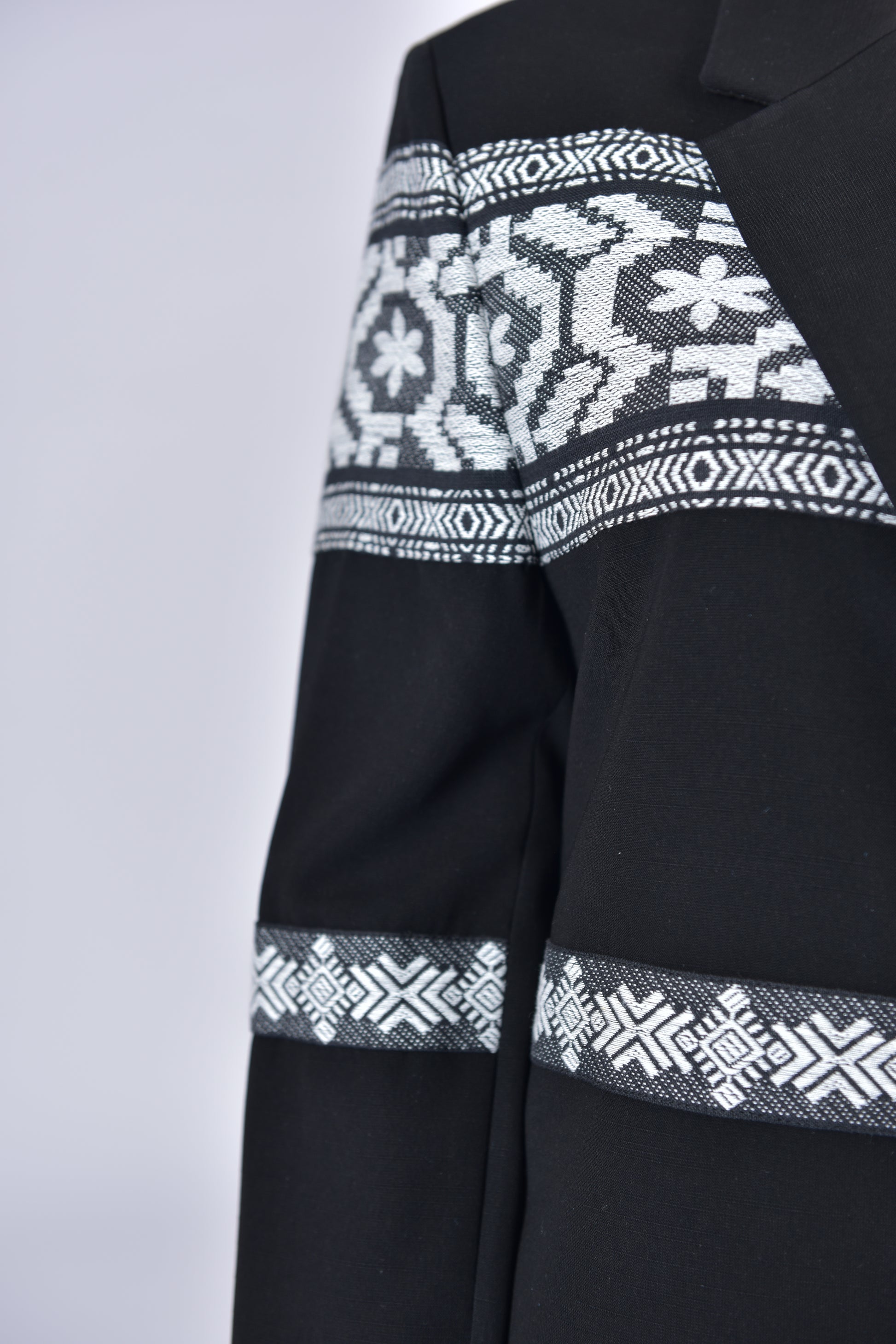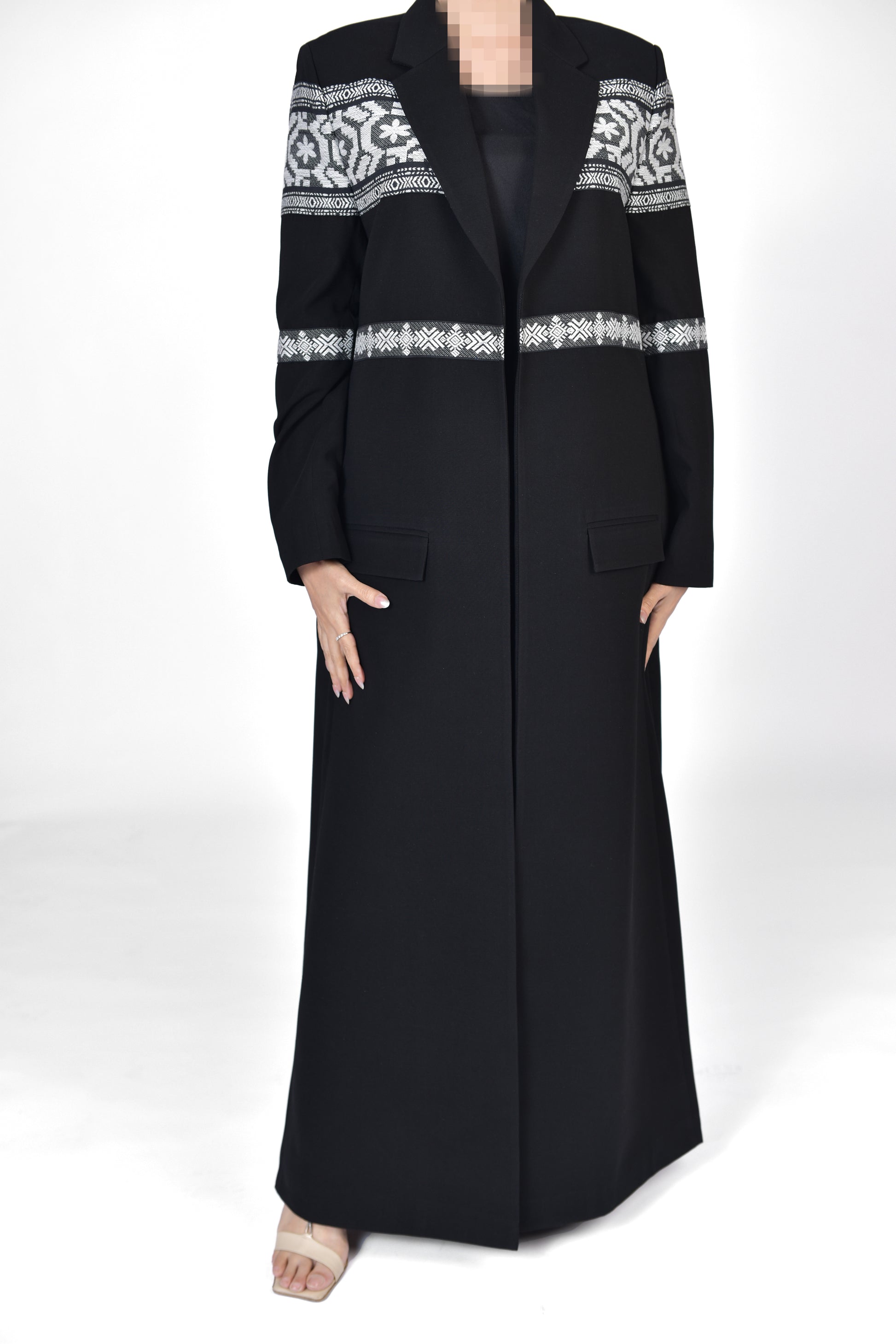 بليزر من الكتان الصيفي الخفيف باللون الاسود ومزينه بنقشات باللون الابيض ويتوفر منه الوان اخرى حسب الطلب