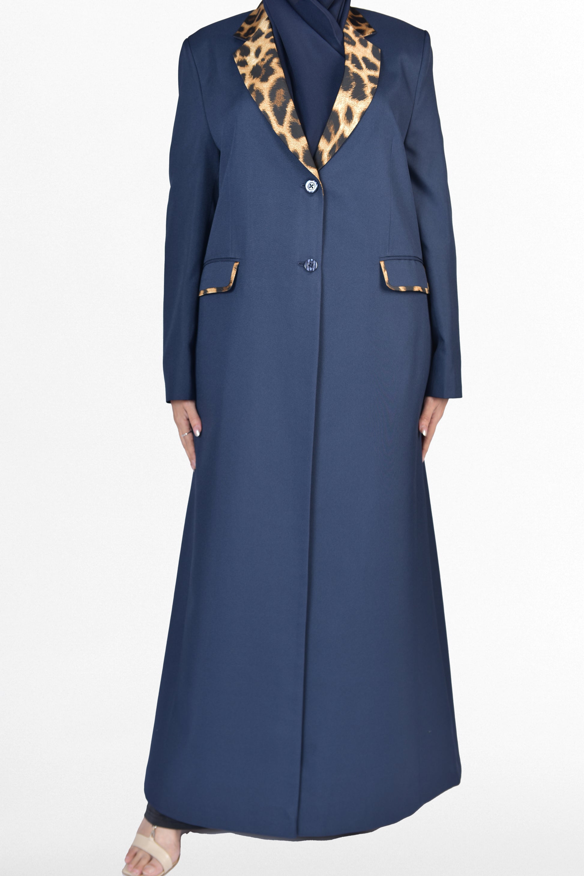 بليزر من الكتان الصيفي الناعم باللون الكحلي ومزينه بقماش من الحرير بنقشة التايقر ويتوفر منه الوان اخرى حسب الطلب