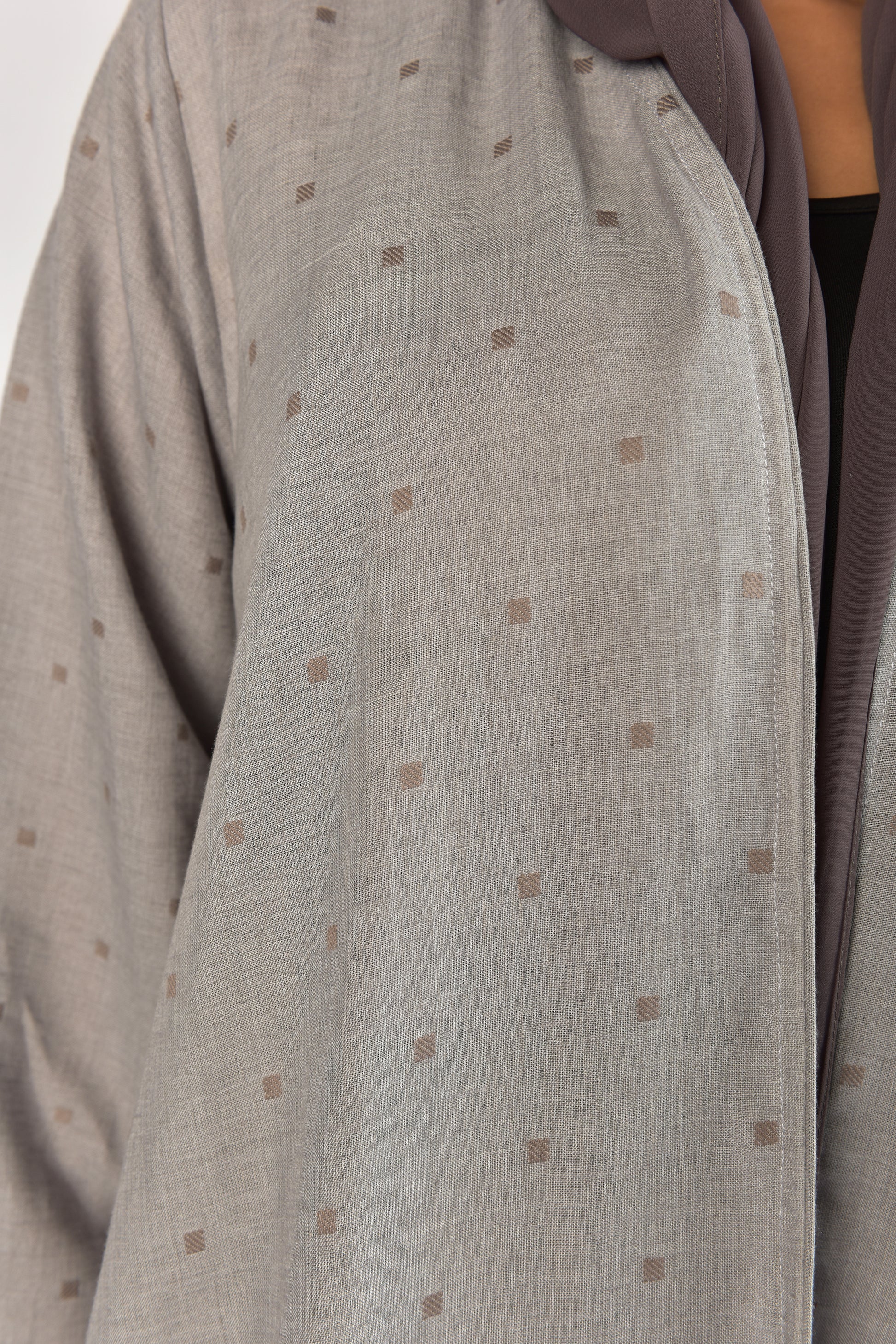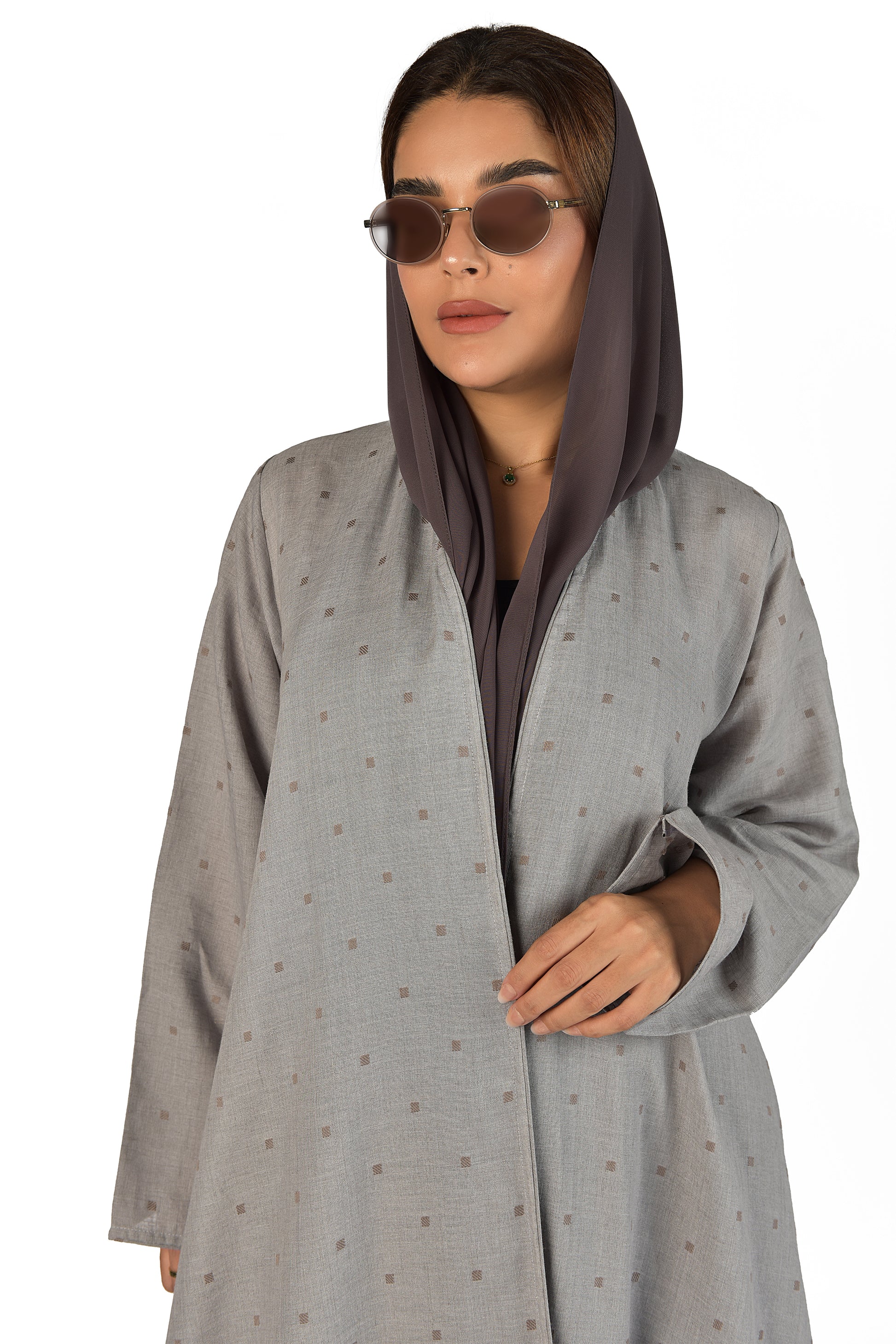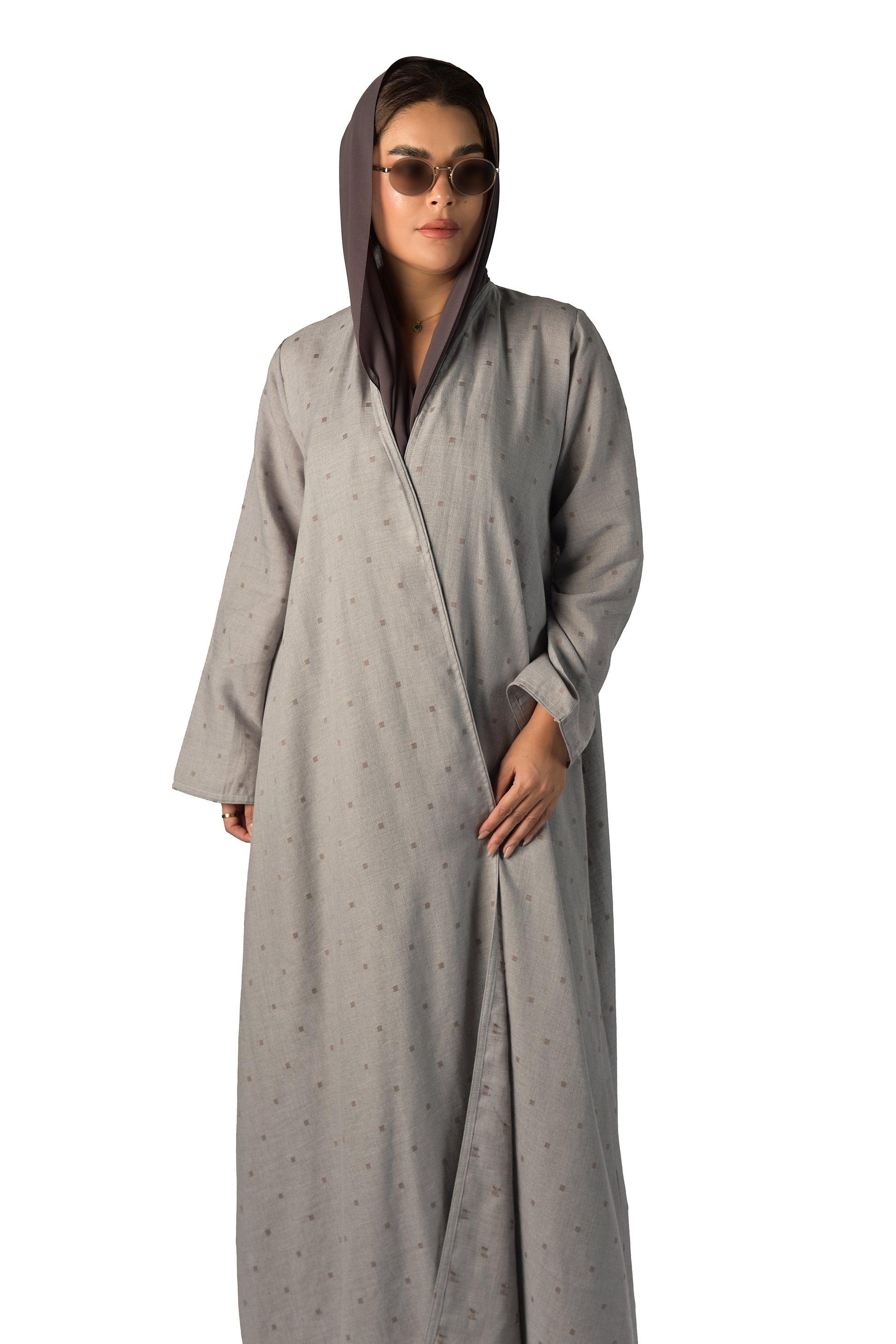 عباية رمادية ناعمة بتصميم بسيط ومريح يعكس الأناقة الهادئة.