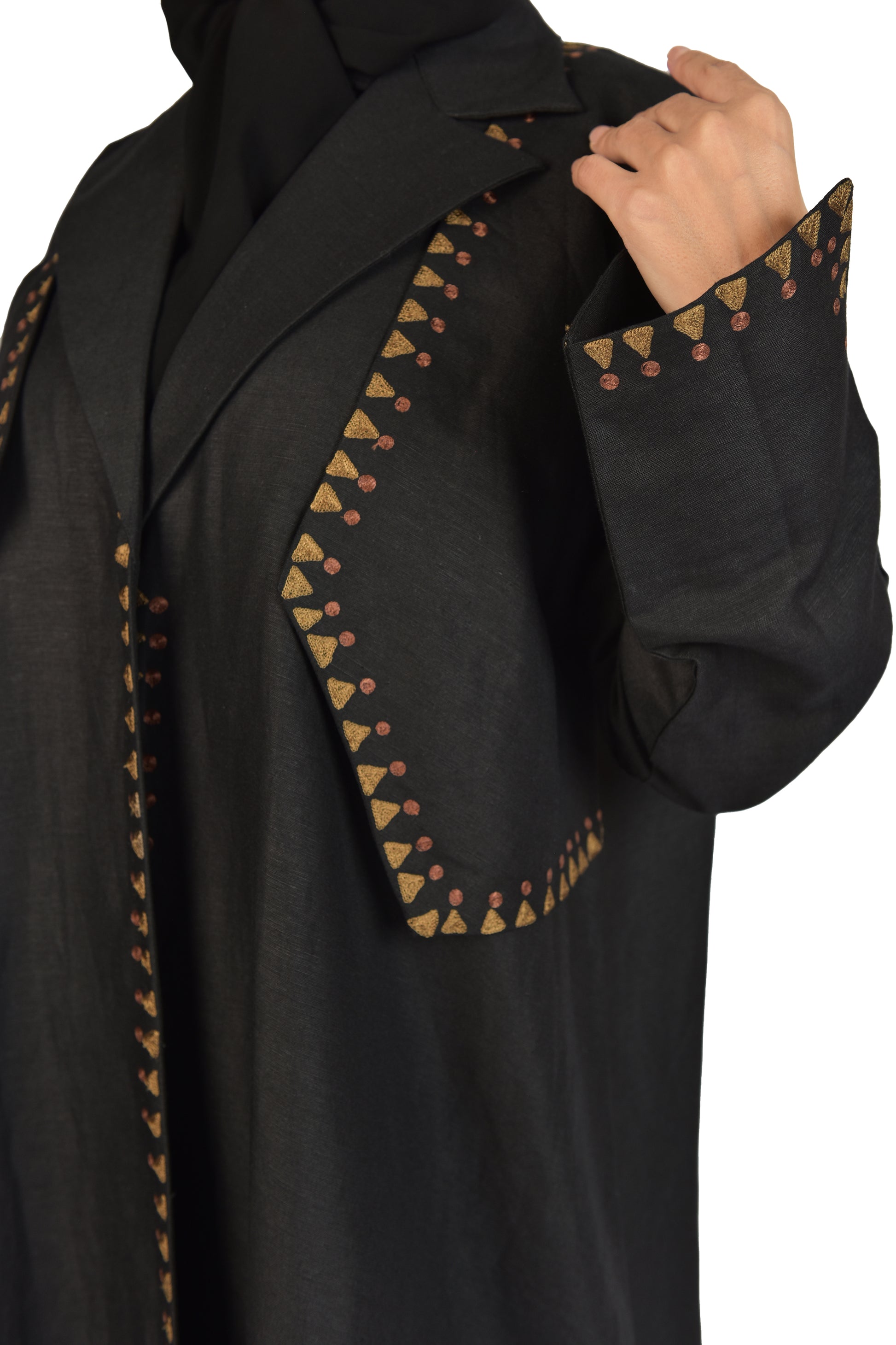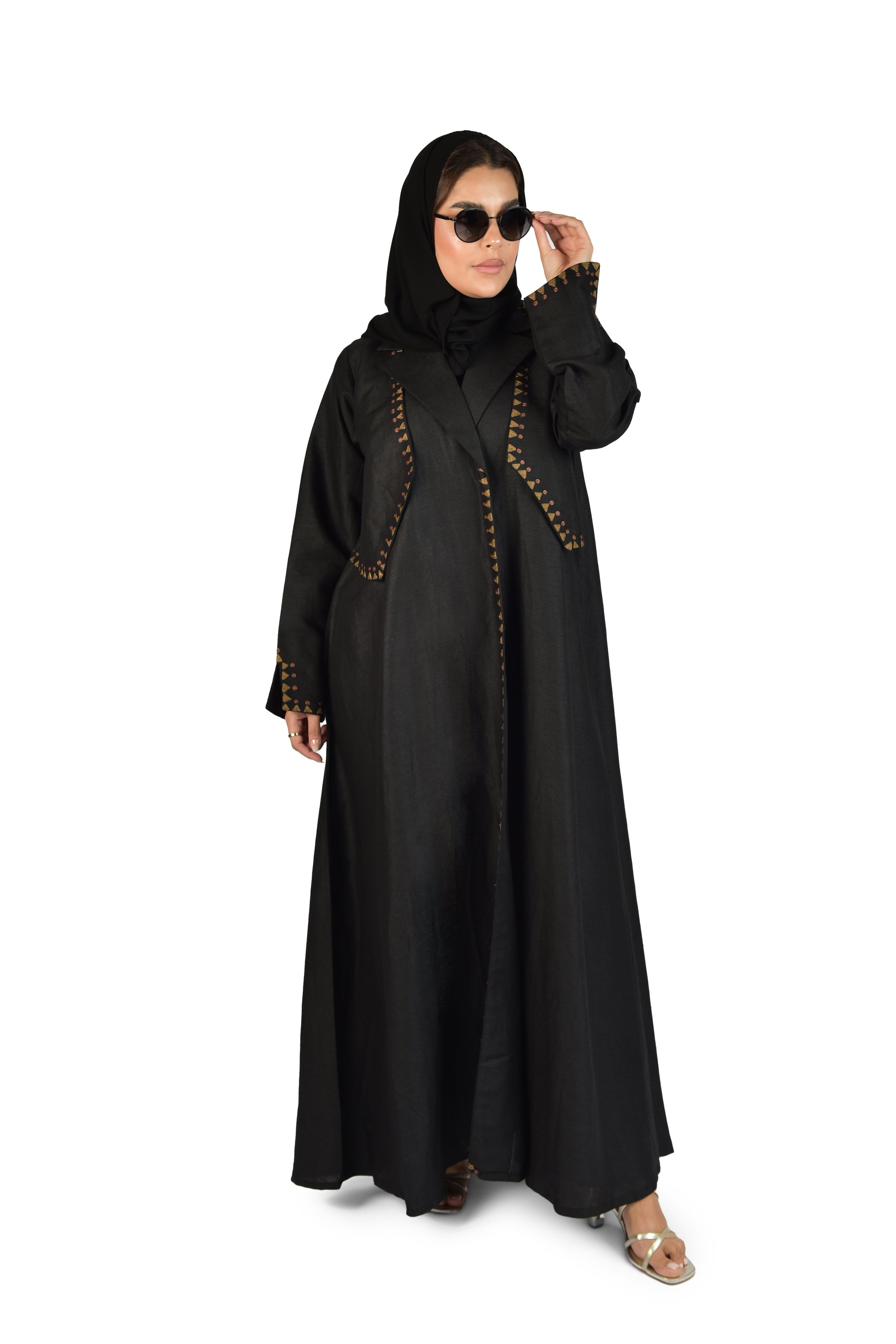 عباية من اللنن الاسود بتصميم تراثي أنيق مزينة بتطريز مثلثات ذهبيه نحاسية . بأسلوب هندسي بسيط يضيف لمسة كلاسيكية عصرية