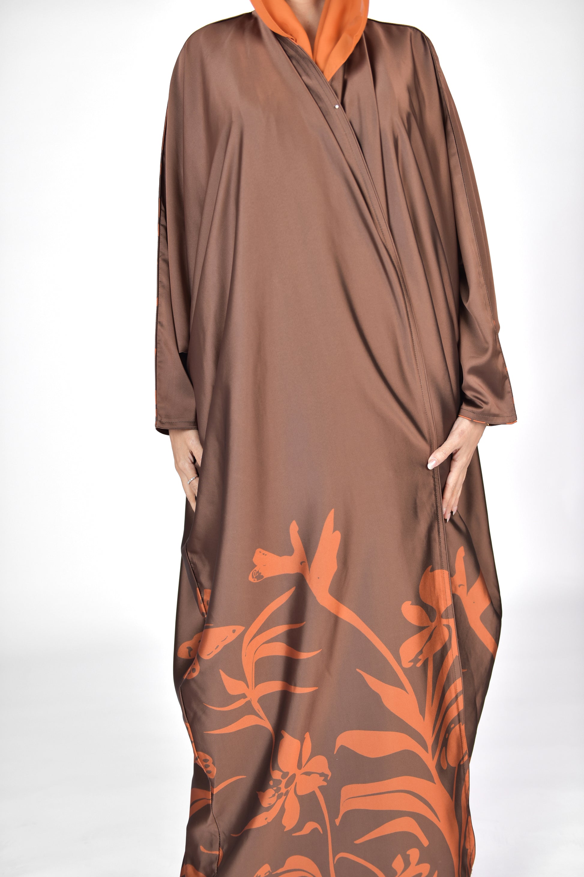 عبايه صيفيه من الحرير الخفيف المشجر باللون البني الفاتح والبرتقالي والغامق