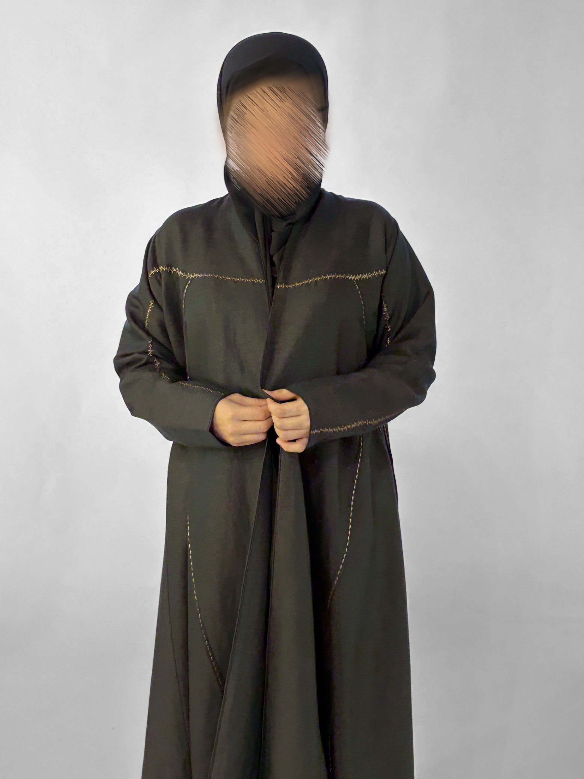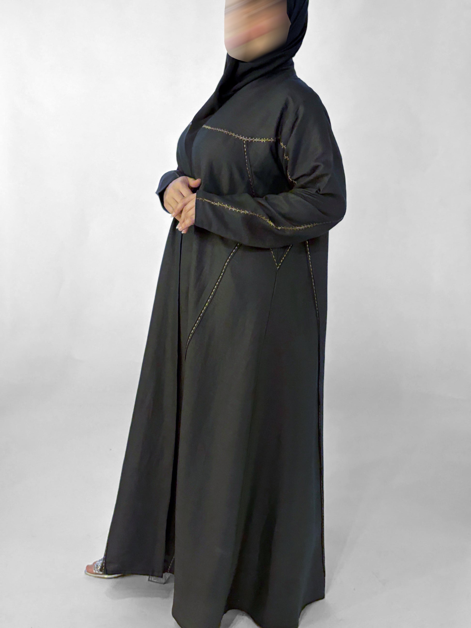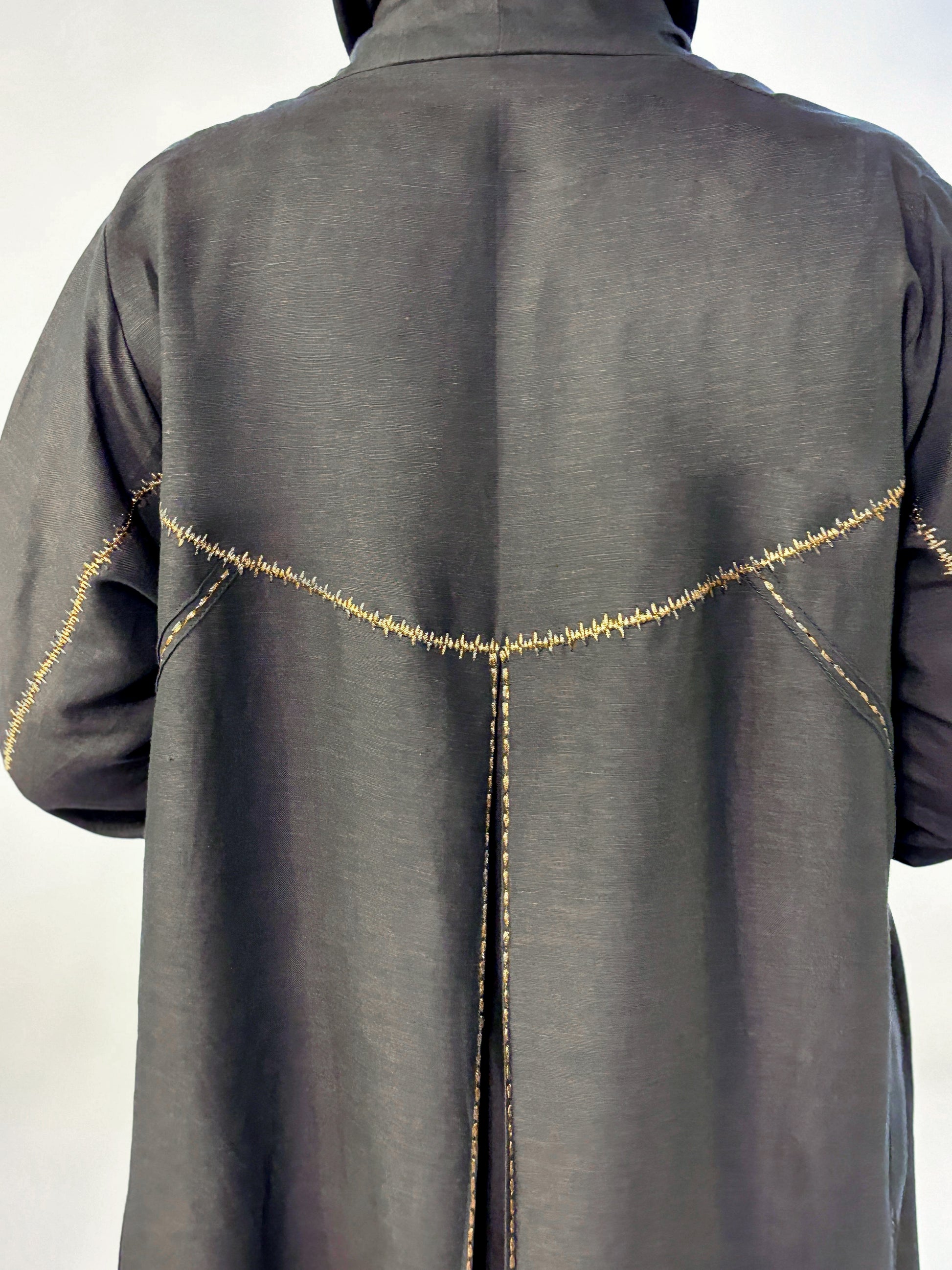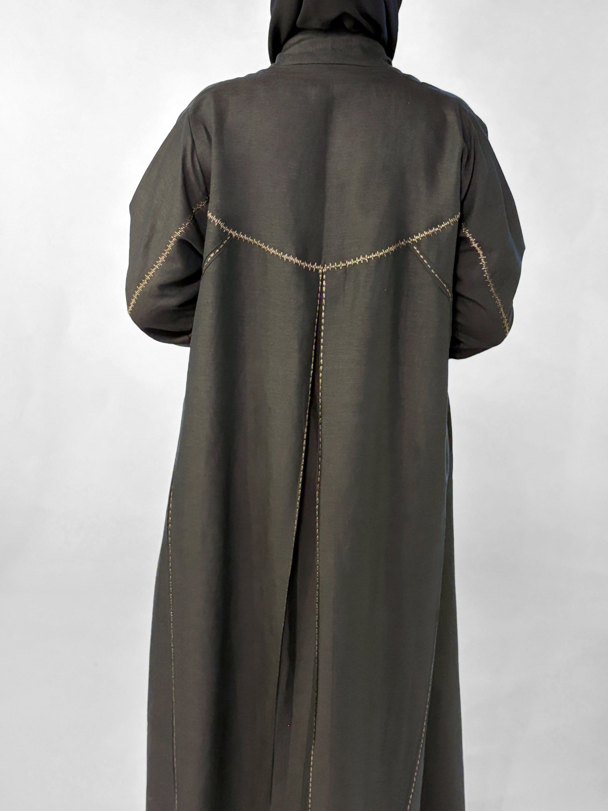 عبايه صيفيه من اللنن الطبيعي باللون الرمادي الغامق مزينة بخطوط راقية من التطريز النحاسي لتمنح الإطلالة اكثر جاذبية الألوان المتوفرة حسب الطلب: أسود، كحلي، وبيج