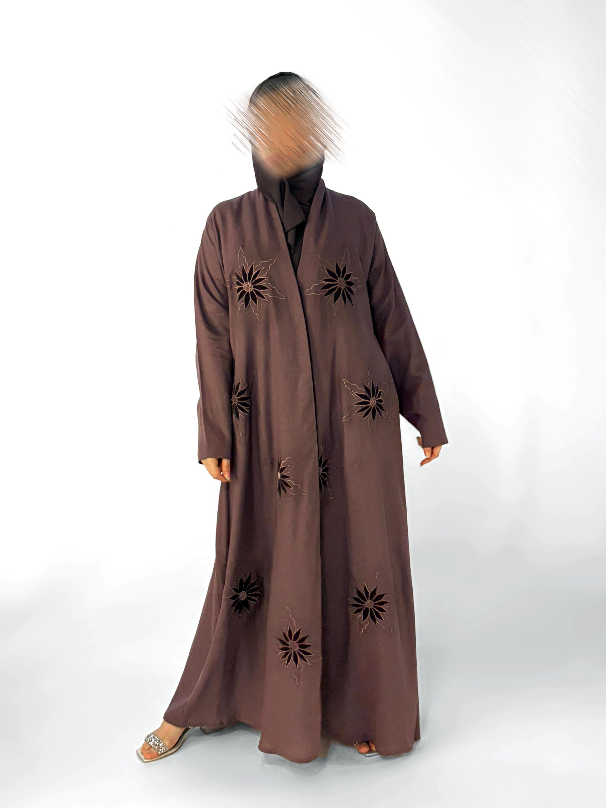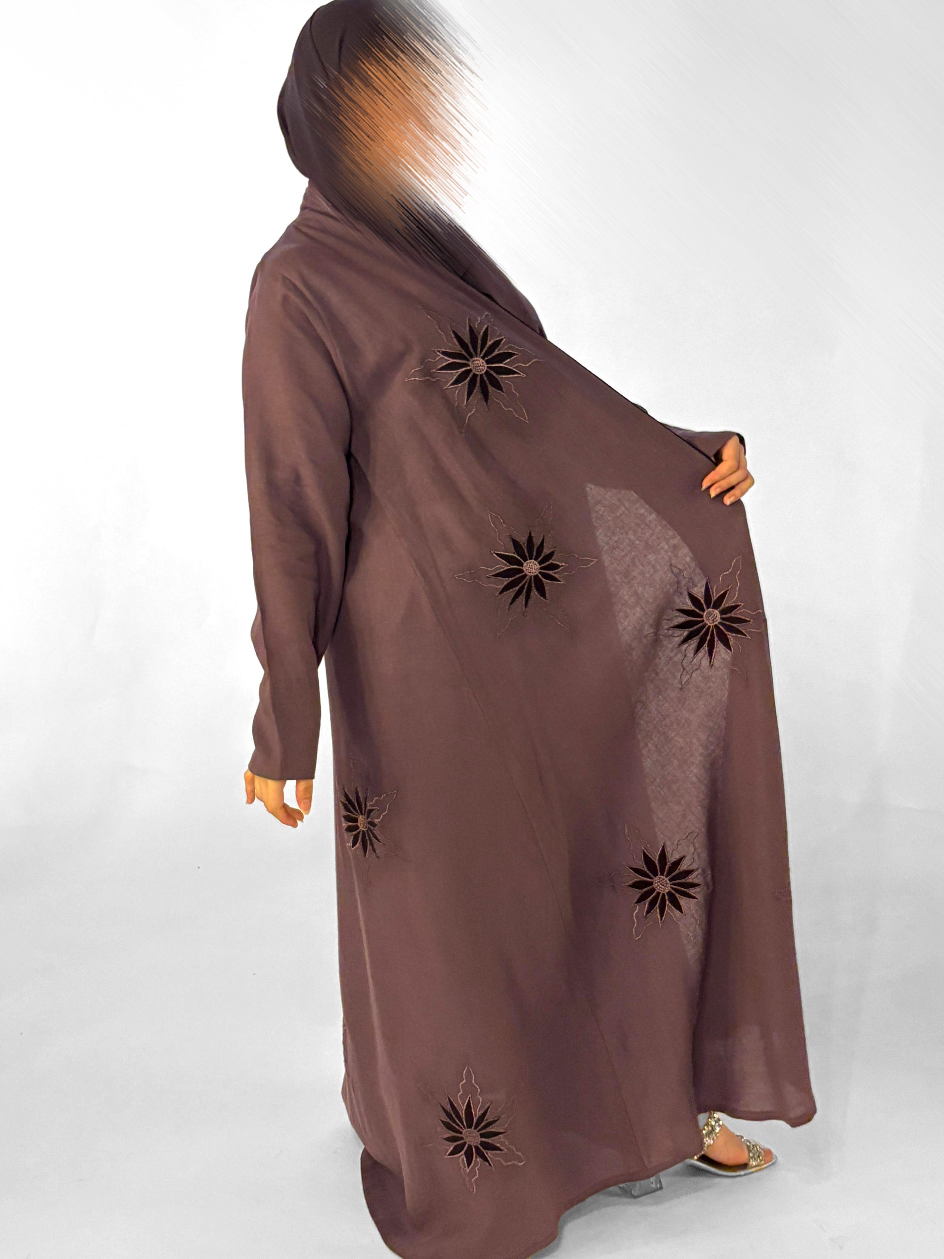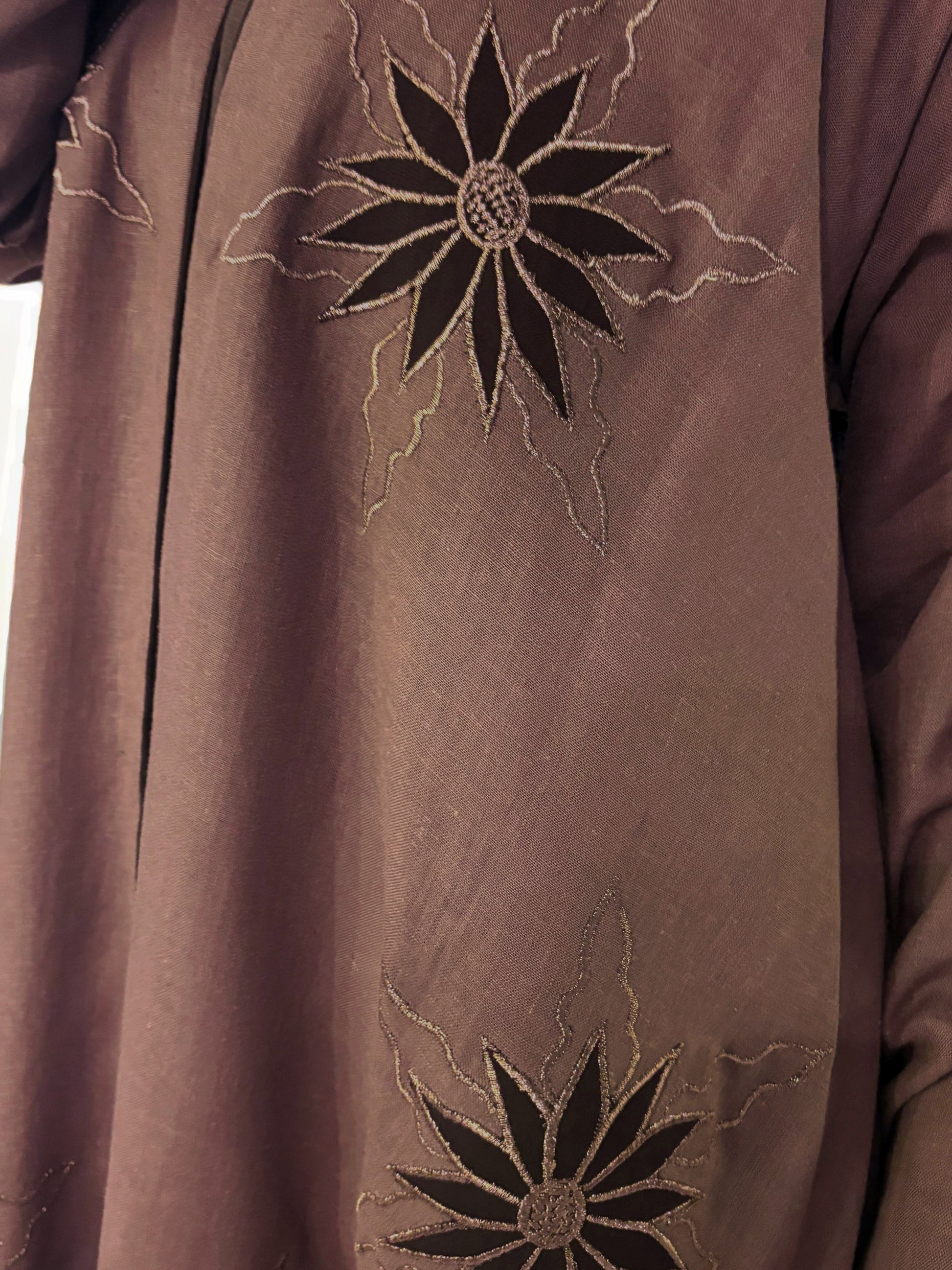 عبايه من اللنن الطبيعي باللون الموف الغامق صيفيه وخفيفه مزينة بورود من المخمل والتطريز الألوان المتوفرة حسب الطلب: أسود، كحلي